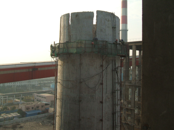 搭建作业平台:在烟囱顶部下方 5-10m 处搭建环形安全平台(用钢管脚手架,立杆间距≤1.2m,外侧挂密目安全网 + 防尘网),平台上铺设防滑钢板,设置护栏(高度≥1.2m)、踢脚板(高度≥150mm)。